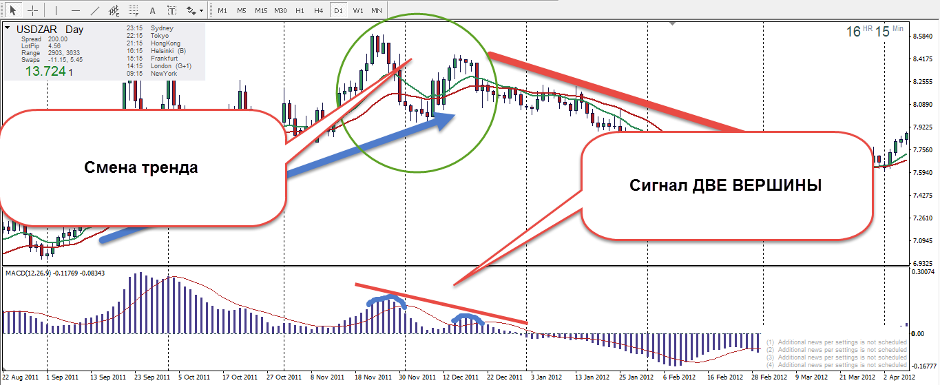 Сигнал «Две вершины». На восходящем тренде, когда гистограмма MACD находится в области положительных значений, вслед за более высокой вершиной, которая является локальным максимумом, формируется более низкая. Это свидетельствует о начале нисходящего движения. Появление третьего локального максимума является продолжением сигнала от второго и усиливает его.